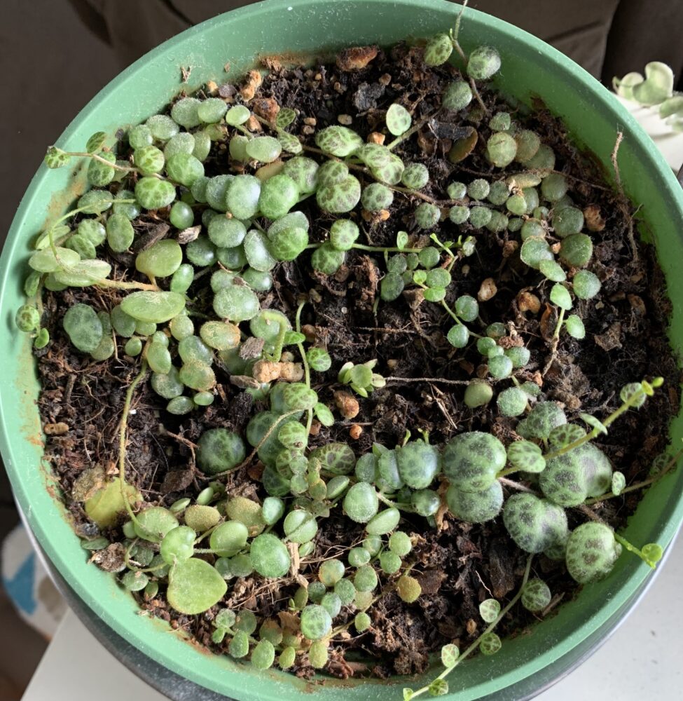 As mentioned above, String of Turtles plants are succulent and you are far more likely to over-water them then under-water them if you aren’t careful. I water mine once every 3-6 weeks depending on how humid and warm it is. In my Northern California humid and cool winters (my house is kept at 63 degrees), I water less frequently or up to every 6 weeks, and in our dry and warmer summers (we don’t have AC), I water closer to every 3 weeks or so. The best thing to do is to take your cues from the plant itself. Only water when: