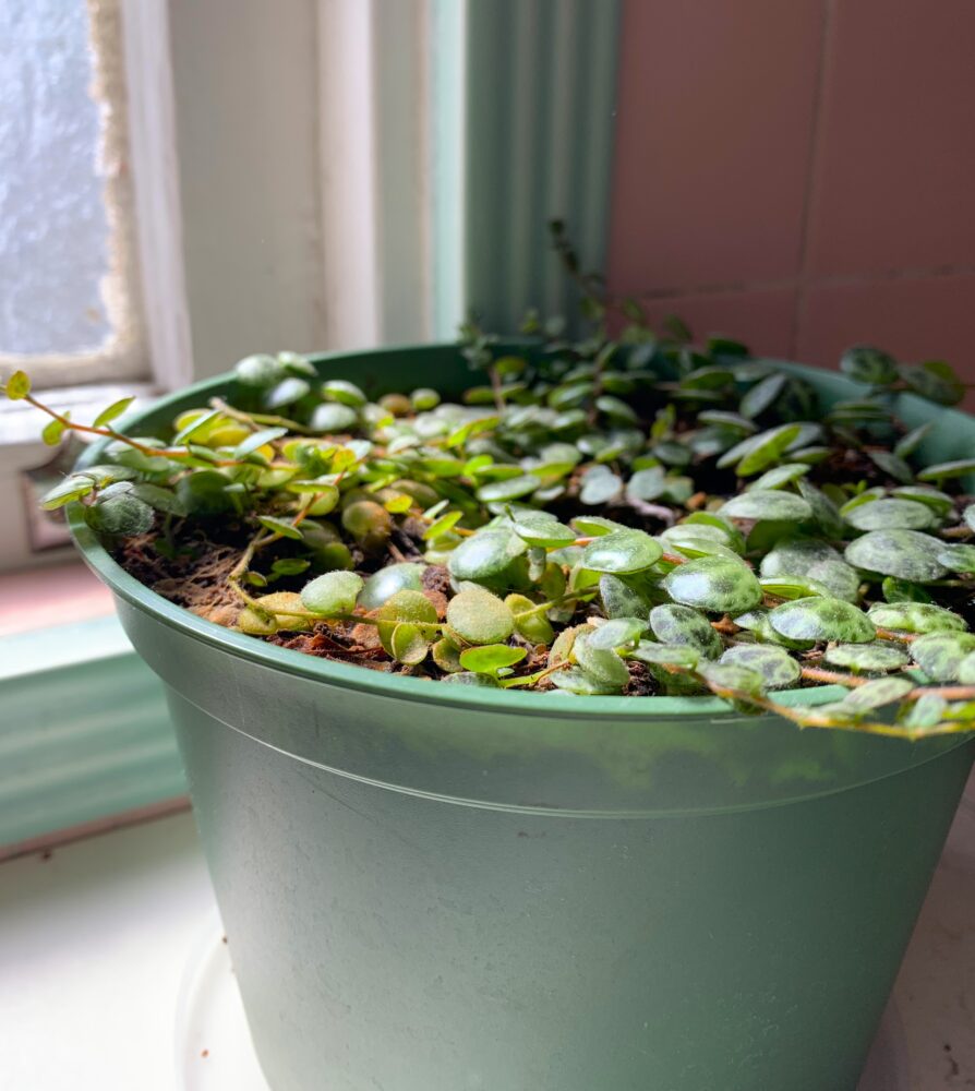 That first summer (June 2021), they were growing and thriving outside, but by the next June (June 2022), you can see that there’s only a few tendrils left. The plant didn’t start dying off until March-April from being outside and it took me some time to realize that I needed to bring them into the warmer house. I think it was cumulative cold temperatures because we didn’t have any freezes that winter. It then took a lot of TLC and time for them to start thriving again, but by January 2023, they were on their way, and now, in March, they are back to their original growth and exploding. You can see the side growth over the edge of the pot – by the end of this summer, I’ll need to have them in a hanging basket so they have room to dangle and grow some more.