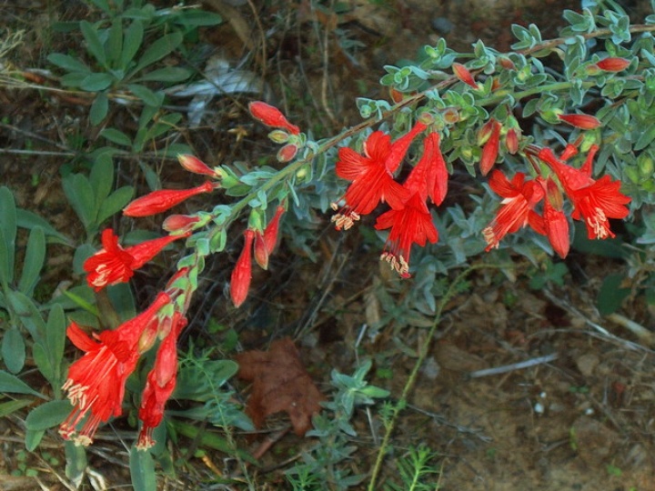 California fuchsias deserve to be in every single yard in California. Most species grow to be about 2-3 feet tall, show off beautiful red to orange flowers in late summer to fall (depends on the plant), and require almost no water once they are established, although they appreciate a good long drink once or twice during our dry summers to stay green. They are a small shrub, getting to be about 2-3 feet wide, but most will gradually spread to take up more room if they can. They are easily pulled up if you want to keep them small, though. The ones that have thin and needle-like leaves can handle sun all day, although the ones will larger leaves will appreciate some afternoon shade to keep them happy.