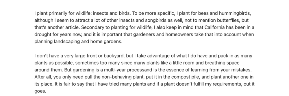 I plant primarily for wildlife: insects and birds. To be more specific, I plant for bees and hummingbirds, although I seem to attract a lot of other insects and songbirds as well, not to mention butterflies, but that’s another article. Secondary to planting for wildlife, I also keep in mind that California has been in a drought for years now, and it is important that gardeners and homeowners take that into account when planning landscaping and home gardens.
