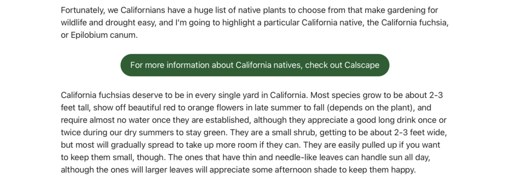 Fortunately, we Californians have a huge list of native plants to choose from that make gardening for wildlife and drought easy, and I’m going to highlight a particular California native, the California fuchsia, or Epilobium canum.